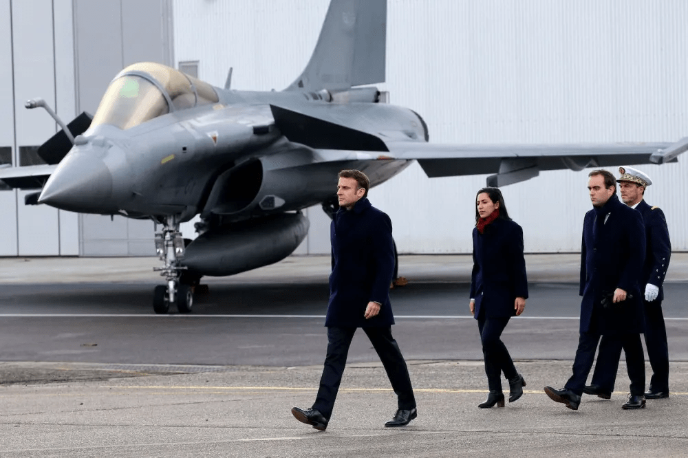 Macron in front of a Dassault Rafale fighter aircraft at the Mont-de-Marsan air base, on Jan. 20. AFP via Getty Images