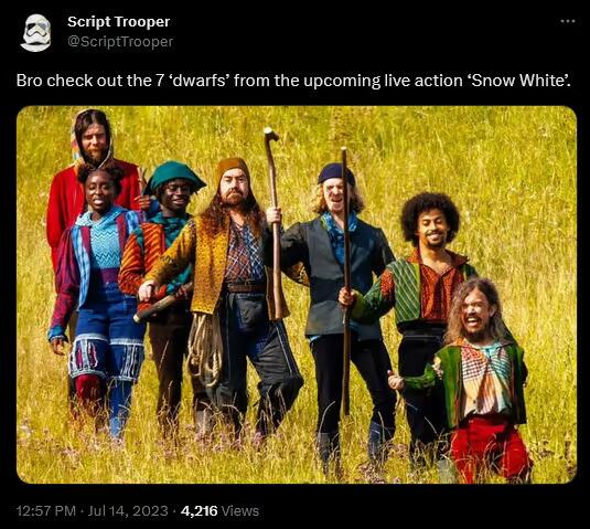 Then there was the leaked production photos of the “Seven Dwarfs”, who were played by a laughably diverse cast of normal sized people. Disney initially lied about the images and claimed they were “Fake and not from our production…” As it turned out, the images were real. The internet collectively laughed and gasped simultaneously at how bad and woke the movie was clearly going to be.