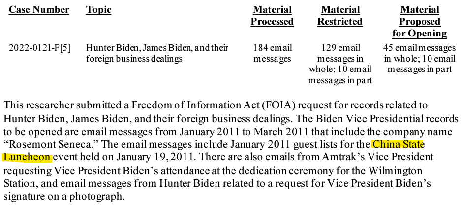 The sheer volume of emails exchanged between Hunter and his associates at Rosemont Seneca and the Office of the Vice President is telling in itself. Just since AFL’s last release, NARA has processed another 861 emails sent or received between January 2011 and December 2013 that contained the name of Hunter Biden’s company, “Rosemont Seneca.”