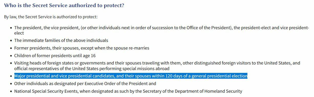 The law authorizes Secret Service protection for major presidential and vice presidential candidates and their spouses within 120 days of the general presidential election. However, the evolution of the protective detail is based upon actual threats and acts of aggression against both the highest public office in the land and those who seek the position.