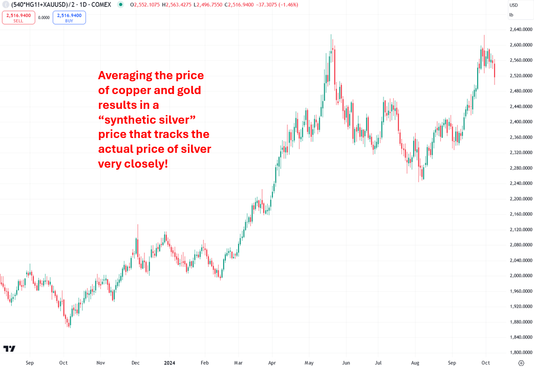 Silver’s price movements are essentially a hybrid of both gold and copper’s market trends. To test this theory, I averaged the prices of gold and copper, adjusting copper’s price (by multiplying by 540) to prevent gold’s higher price from exerting undue influence. Then, I created a chart based on that adjusted average. Sure enough, the resulting chart bears a striking resemblance to silver’s price chart: