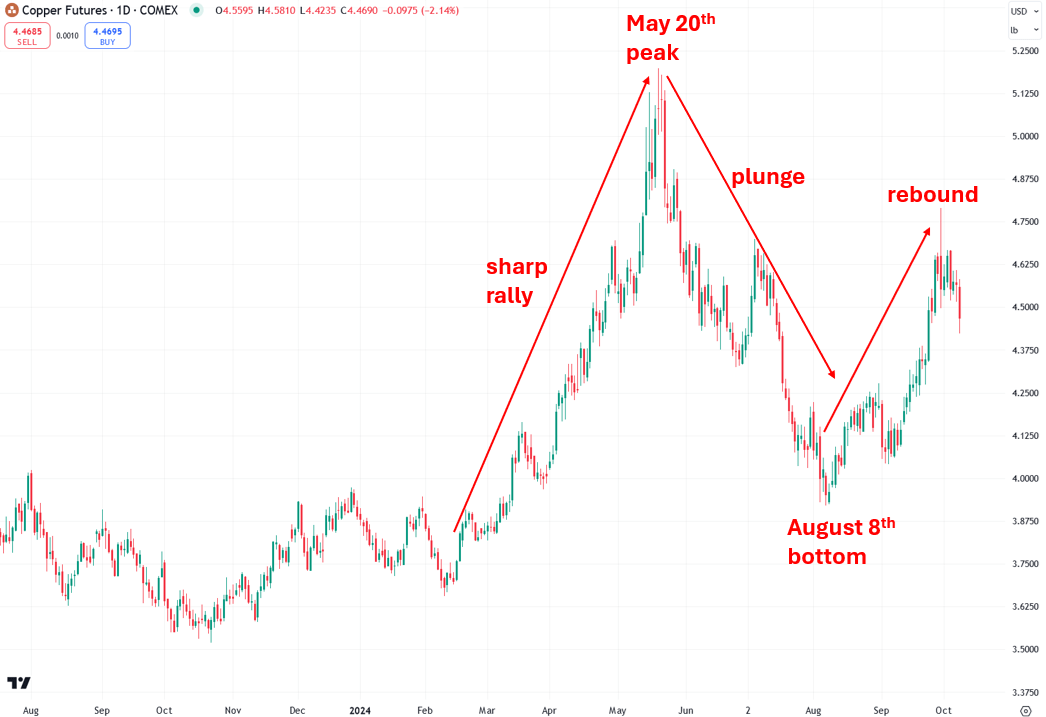 Like gold, copper experienced a strong rally in the spring, but it peaked on May 20th and quickly reversed, wiping out most of its gains—unlike gold, which continued to rise. Copper bottomed on August 8th and has rebounded quite a bit since then and is now in a confirmed uptrend once again: