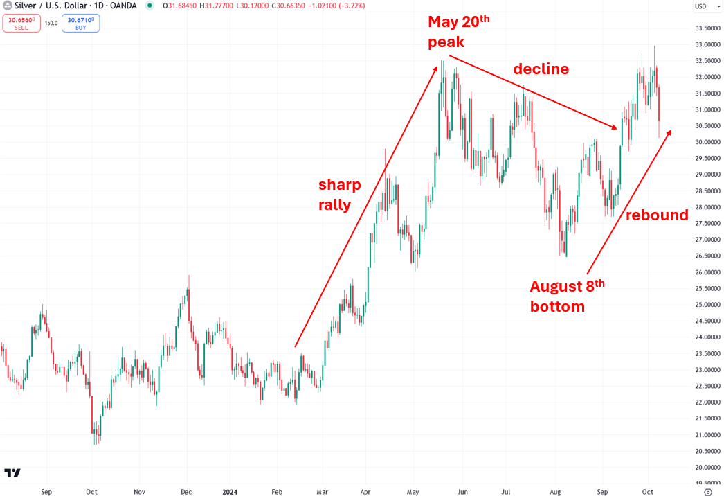 Finally, we come to silver, which, like gold and copper, saw a sharp rally in the spring. Like copper, silver peaked on May 20th and experienced a sharp decline, though not as severe as copper’s drop. While silver and copper suffered throughout the summer, gold steadily continued its ascent. Silver, like copper, bottomed on August 8th and has been staging an impressive recovery ever since.